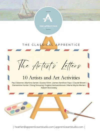 This unique art resource is designed especially for elementary students and is perfect for both classroom teachers and homeschool families. The Artists’ Letters introduces students to 10 famous artists—from Claude Monet to Clementine Hunter—through imaginative, first-person letters written as if the artists are speaking directly to the child (Sample letter here). These engaging letters make each artist feel personal and relatable, opening the door for deeper exploration of their lives and work.